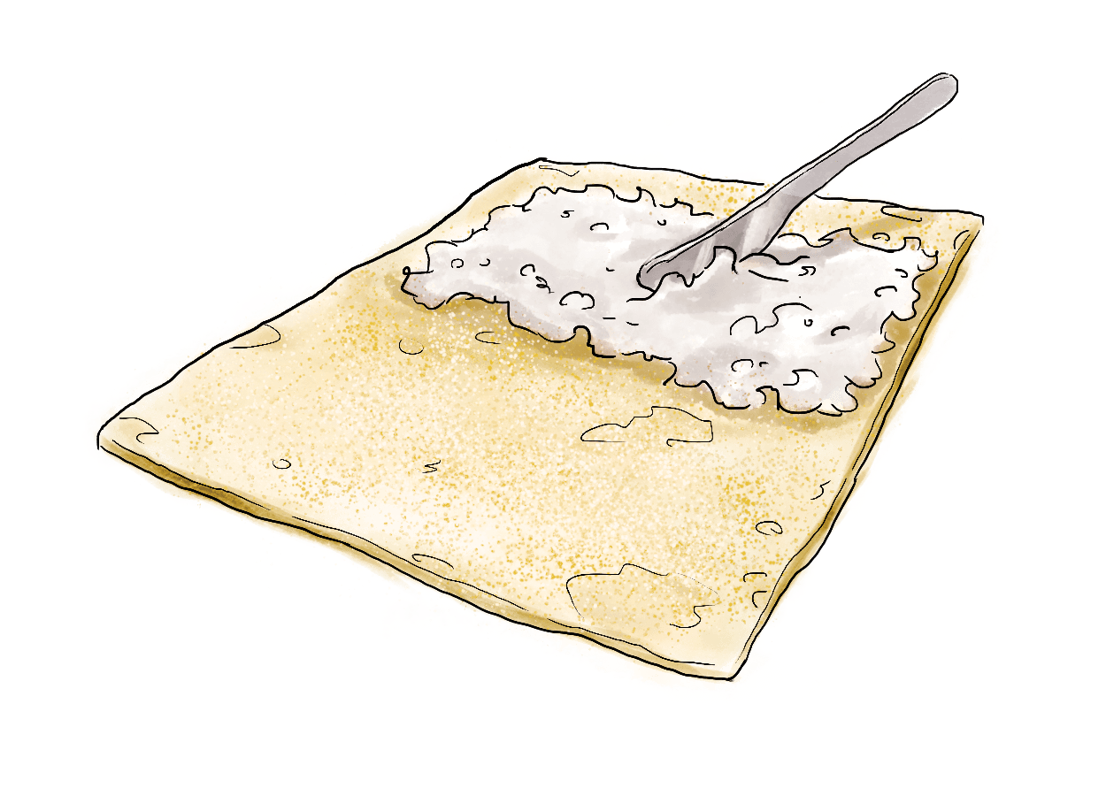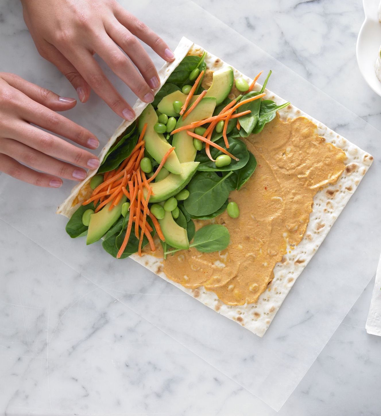 Spread cream cheese, hummus, or a nut butter on the farthest half to seal.