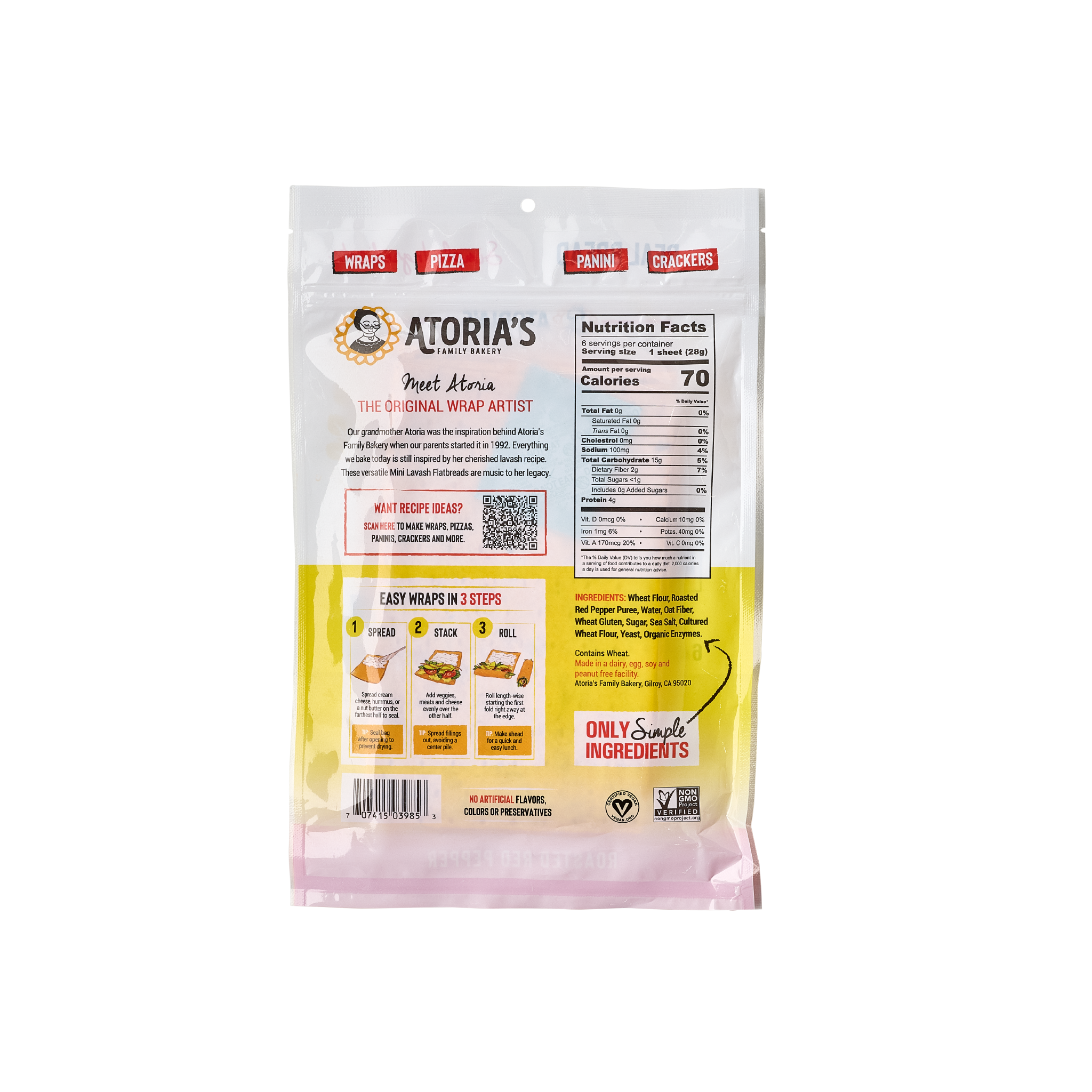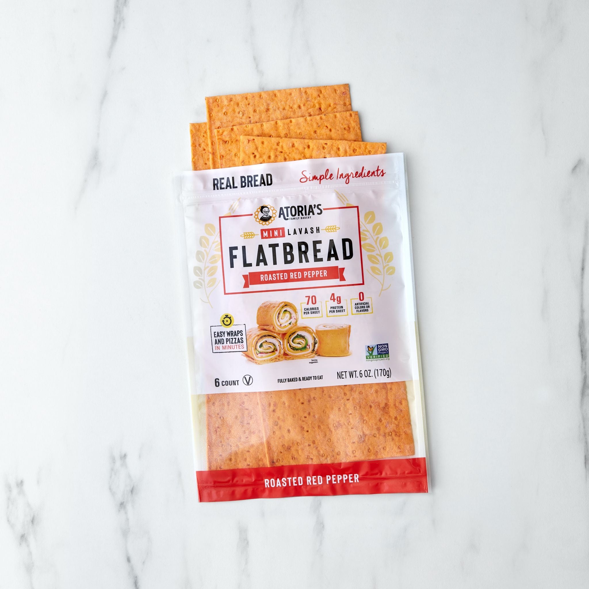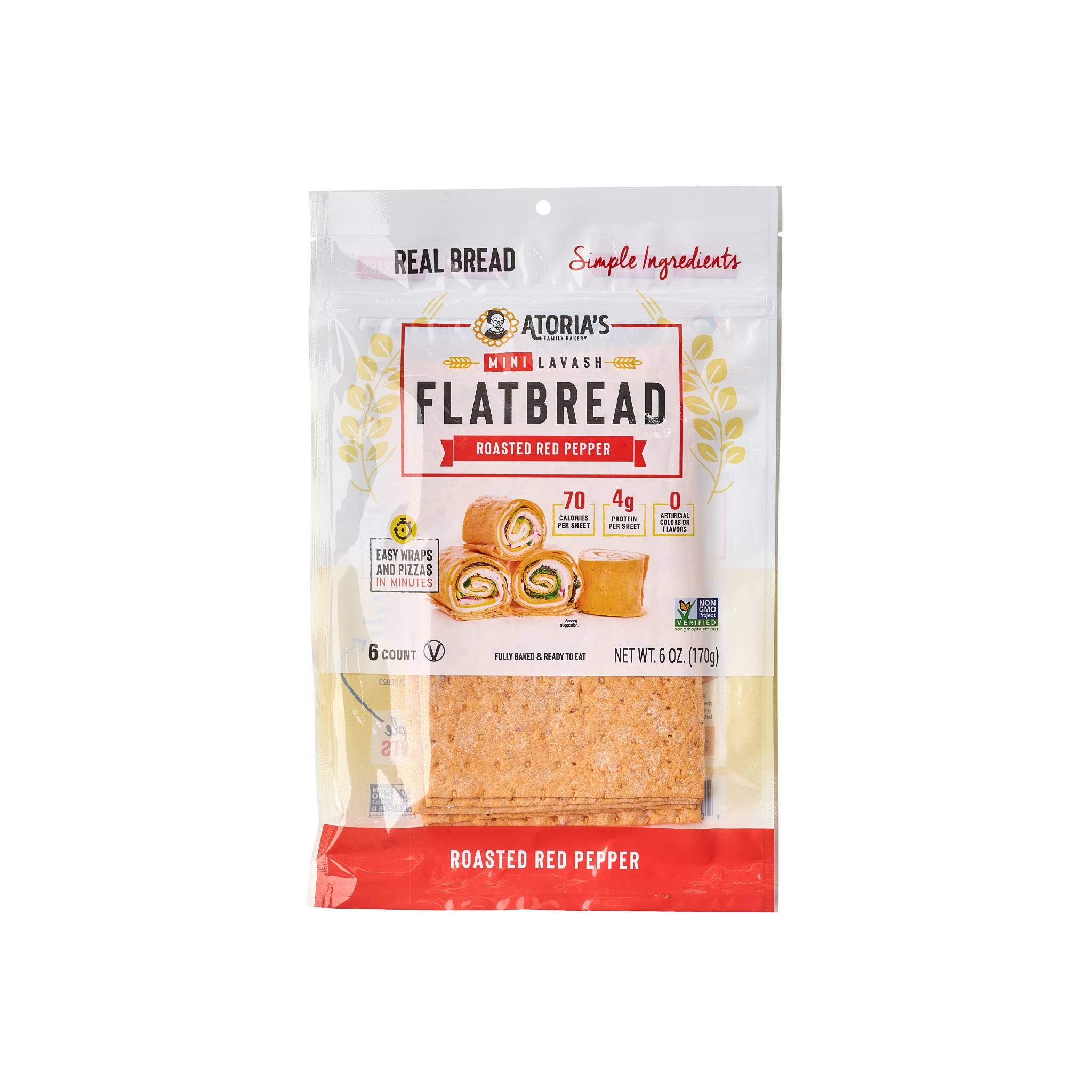 This sweet and savory, personally sized flatbread is baked with locally sourced, roasted red pepper puree. Naturally bright in color, the mini Lavash has a delightfully rich bell pepper taste with both sweet and smoky undertones.
